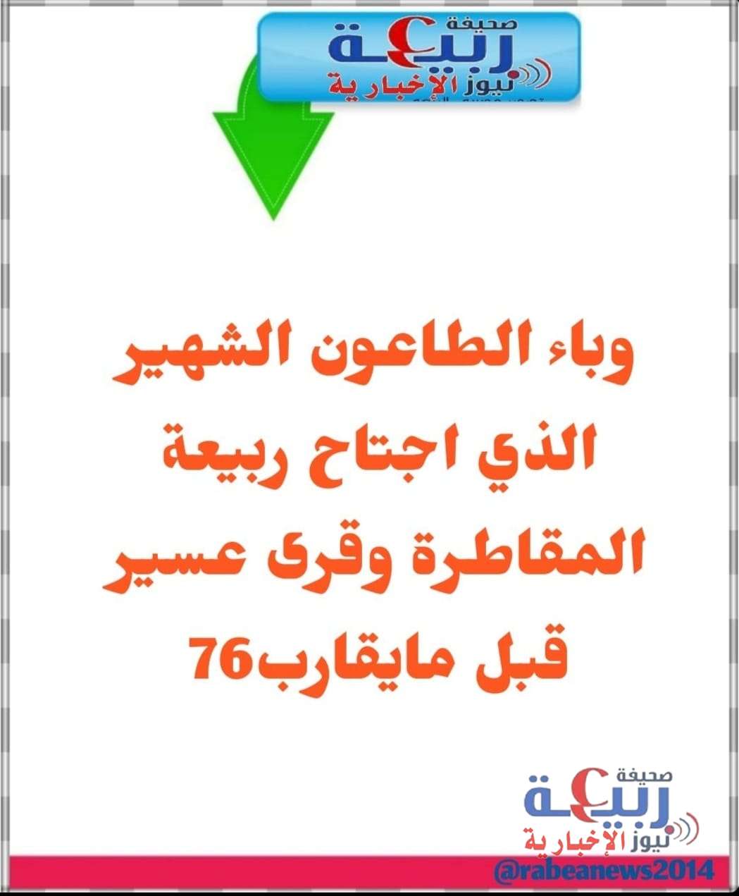 ذكر عدد من كبار السن بربيعة المقاطرة لصحيفة ربيعة نيوز الإخبارية فيروس_كورونا الجديد اعاد للاذهان وباء الطاعون الذي ضرب المنطقة قبل حوالي 76عامآ وراح ضحيته عدد من أبناء القبائل واضافو انه لم يكن هناك مستشفيات او مستوصفات وإمكانيات طبية كما يوجد الآن ولله الحمد وكان الاعتماد على شرب المياه وقليل من العسل وانتظار المصير اما التعافي أو الموت وعن اعراض المرض قالو. ان اعراضه ضيق بتنفس وزكام وارتفاع في درجة الحرارة وسعال مستمر وعن اسباب انتشاره. اكدو أن الأسواق الشعبية كانت من اهم الأسباب التي أدت الئ تفشي المرض حيث كانو يرتادونها التجار والباعه المتجولين من مختلف المناطق مما أدى إلى انتقال المرض بسهوله.