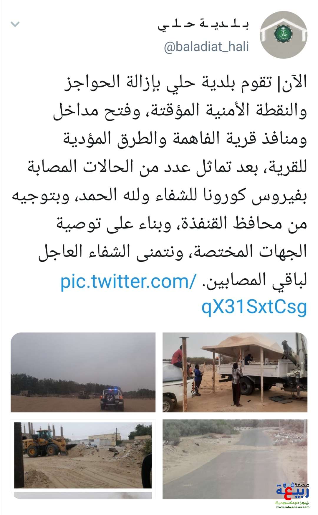 ذكرت بلدية حلي التابعة لمحافظة القنفذه عبر حسابها على توتير انها قامت بإزالة الحواجز المؤقتة لمنافذ قرية الفاهمة التابعة لمركز حلي بعد تماثل عدد من الحالات للشفاء بعد اصابتها بفيروس كورونا في وقت سابق ويأتي ذلك الإجراء بناء على توجيه محافظ القنفذة وبناء على توصيات الجهات المختصة…