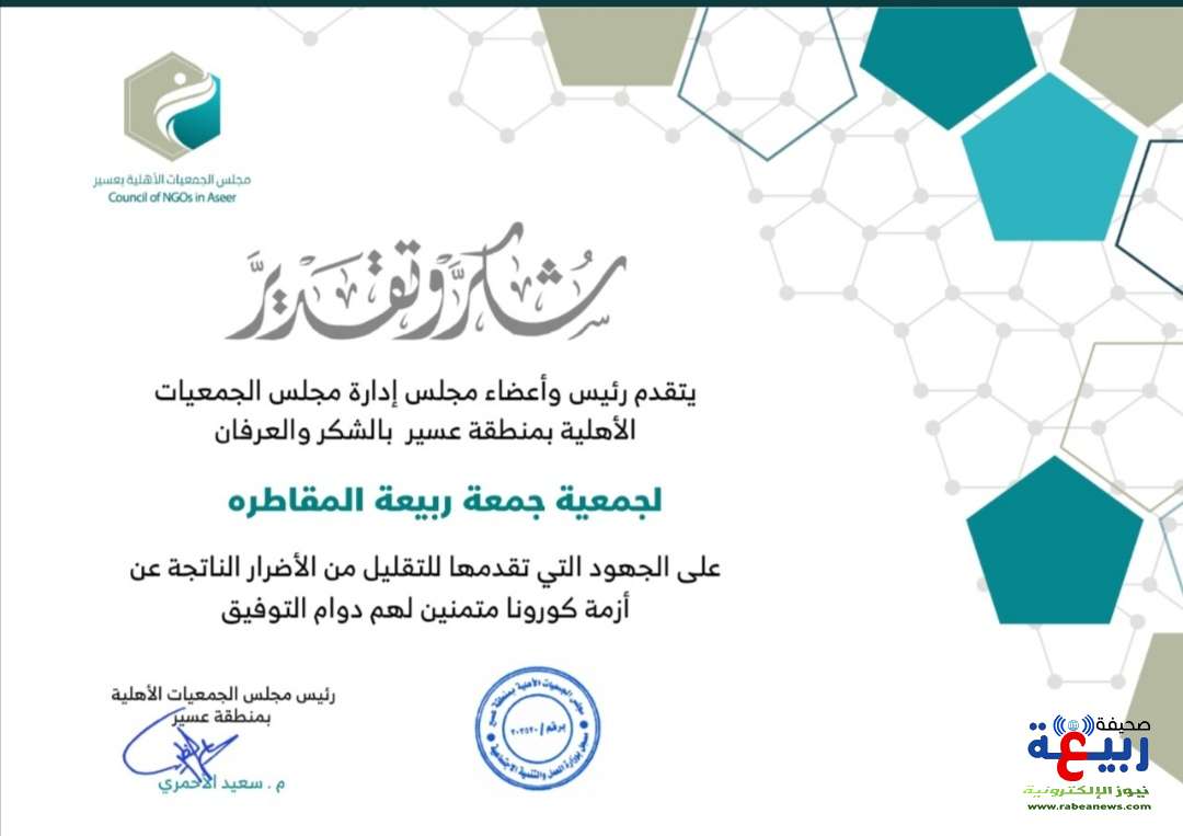 حصلت الجمعية الخيرية بمركز جمعة ربيعة المقاطرة التابع لمحافظة بارق على شهادة شكر وتقدير من رئيس واعضاء ادارة مجلس الجمعيات الأهلية بمنطقة عسير