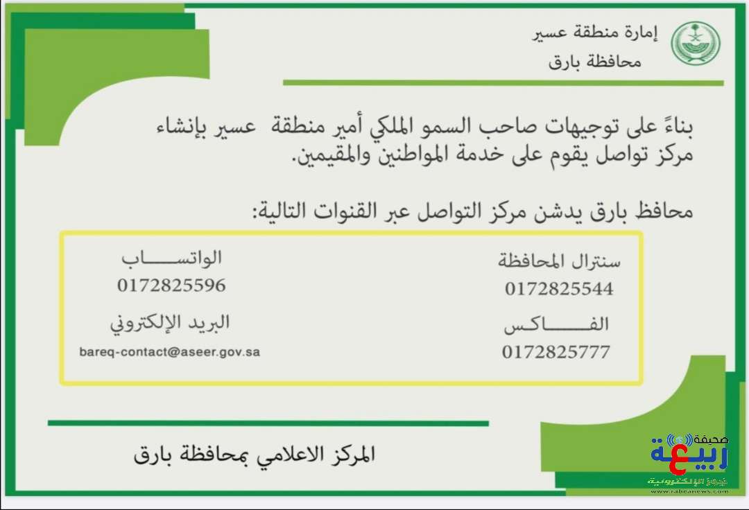 إنفاذاً لتوجيهات أمير منطقة عسير صاحب السمو الملكي الأمير تركي بن طلال -حفظه الله- بإنشاء مركز تواصل يقوم على خدمة المواطنين والمقيمين دشنت محافظة بارق مركز للتواصل عبر وسائل التواصل الإجتماعية .