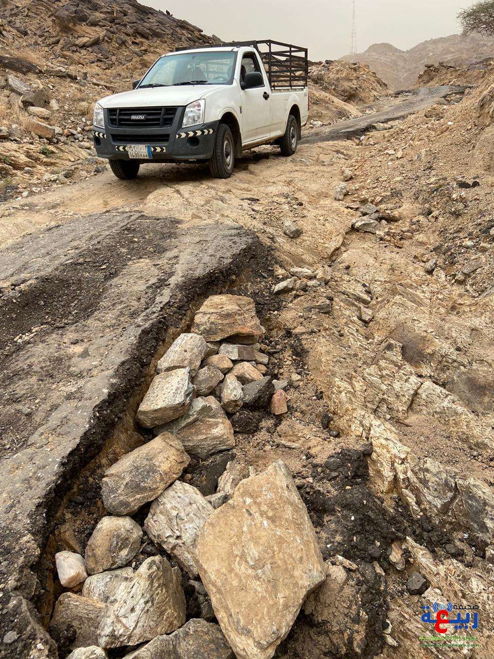 يظهر من خلالها تلف تام لطريق المؤدي للقريه جراء هطول الأمطار عليه خلال الأيام الماضية مما جعل العبور من خلاله اشبهه بالمغامره لما قد يسببه من تلفيات واعطال للمركبات.