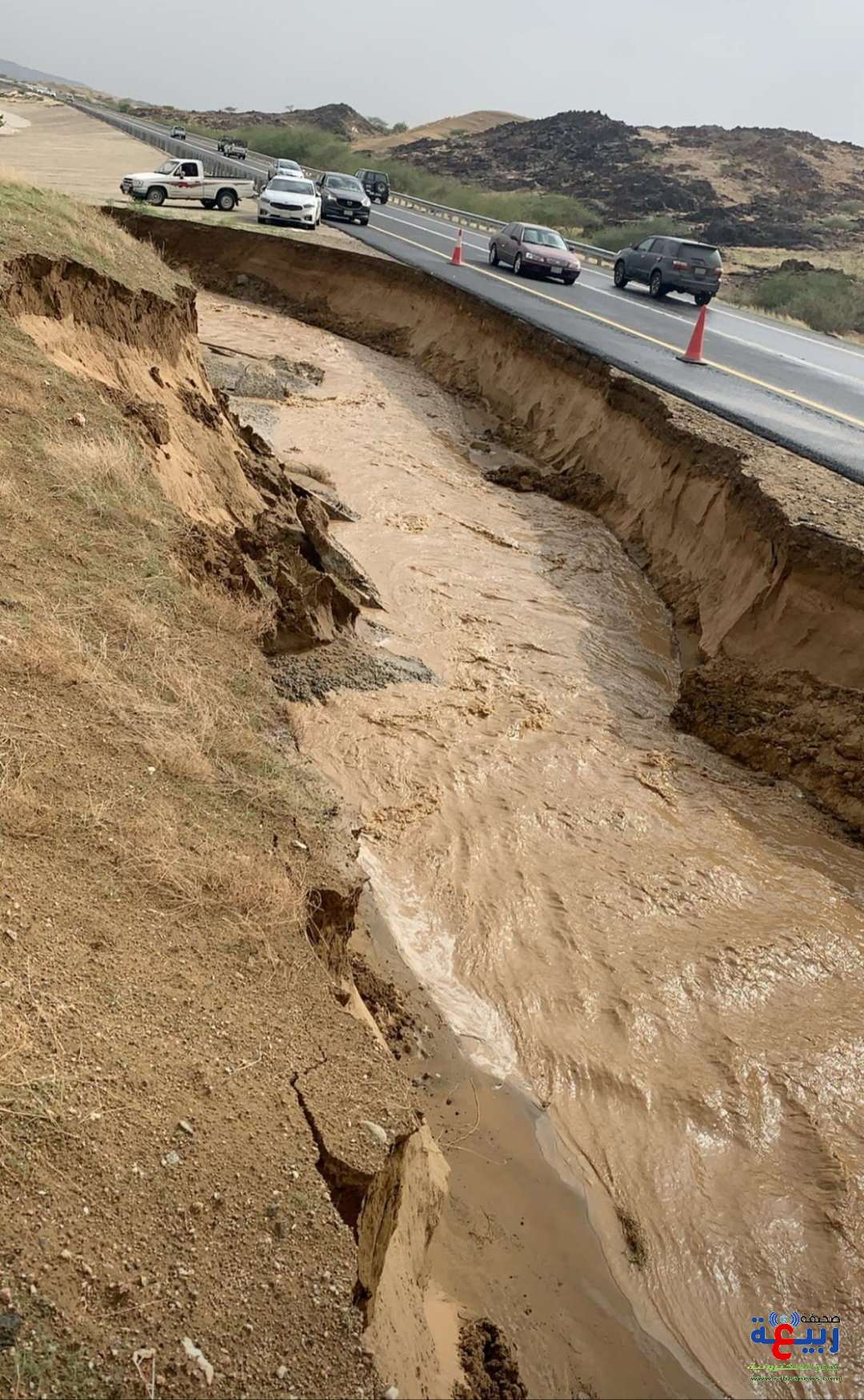 وقد تضرر من مياة السيول والأمطار هذا واظهرت الصور انجراف التربة المحاذيه لطريق مما قد يتسبب بحدوث انهيار بالطبقة الاسفلتيه مع عبور المركبات للكثافه المرورية التي يشهدها الطريق.