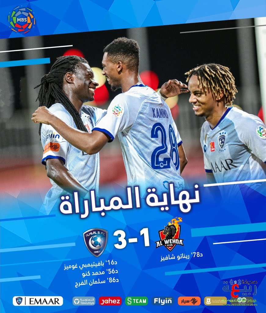 انتصر الهلال بطل دوري الأمير محمد بن سلمان على نادي الوحدة في ملعب الشرائع بثلاثية مقابل هدف وحيد ، وقد فضل مدرب الهلال إراحة عدد من الاعبين الأساسيين وكان من ابرزهم الحارس عبدالله المعيوف و اللاعب الايطالي جوفينكو وقلب الدفاع جانغ هيون سو والظهير محمد البريك ، وبعد اول ربع ساعة من الشوط الأول تمكن المهاجم قوميز من تسجيل اول اهداف الهلال عند الدقيقة 16 وانتهى الشوط الأول بتقدم الهلال بهدف وحيد وفي الشوط الثاني سجل محمد كنو هدف الهلال الثاني من رأسيه في الدقيقة 57 ليتقدم الهلال بهدفين مقابل لا شيء للوحدة وبعد ضغط من الهجوم الوحداوي على مرمى حارس الهلال محمد الواكد سجل لاعب الوحدة شافيز الهدف الأول قبل نهاية المباراة بعشر دقائق ولكن بهدف قاتل من سلمان الفرج في الدقيقة 85 ليحسم المباراة ويضيف ثالث أهداف الهلال وينتصر بنتيجة 3-1 ضد الوحدة ، وفي الجانب الآخر اقترب نادي الهلال من كسر رقم قياسي سابق لنادي النصر وهو إحراز 70 نقطة في موسم واحد ويملك نادي الهلال الآن 69 نقطة وفي حال فوزه على الشباب في الجولة القادمة سيحطم الهلال الارقام القياسية بواقع 72 نقطة لدوري الامير محمد بن سلمان 2020 .