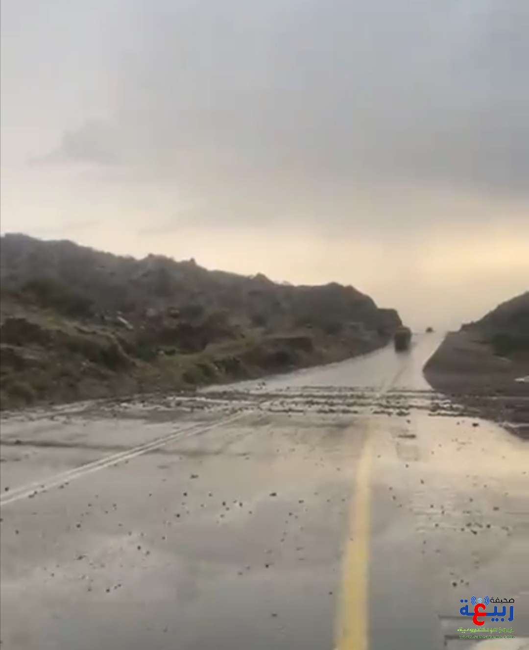 يظهر تساقط عدد من الصخور بالطرق ونوه المغردين عابري الطريق إلى توخي الحيطة والحذر نظرا لما قد تسببه تلك الصخور من حوادث مرورية لاقدر الله. هذا وشهد مركز آحد ثربان هطول امطار غزيرة عصر اليوم الجمعة.