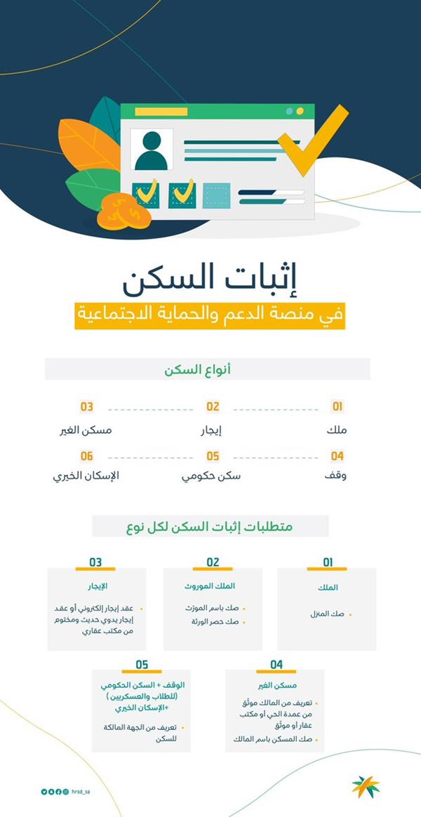 أوضحت وزارة الموارد البشرية والتنمية الاجتماعية، طريقة إثبات السكن لمستفيدي الضمان الاجتماعي في منصة الدعم والحماية الاجتماعية، وذلك لكل أنواع السكن التي تشمل الملك والإيجار ومسكن الغير والوقف والمسكن الحكومي والإسكان الخيري.