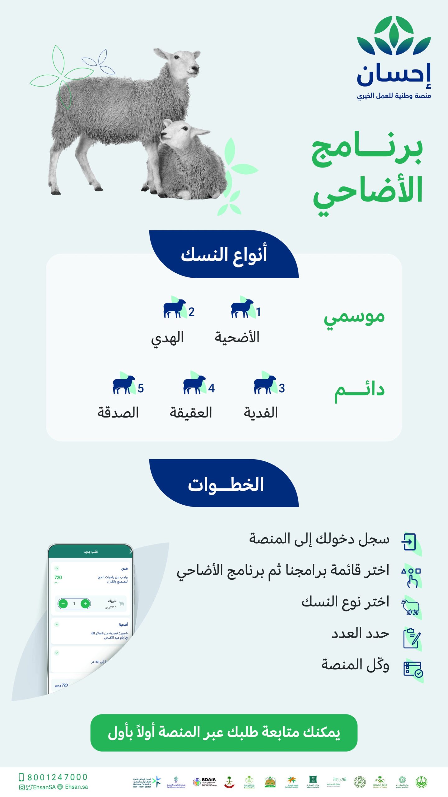 ويأتي برنامج الأضاحي تسهيلاً لأداء النسك رقمياً على المضحين والحجاج عبر تقديم طلبات الأضاحي والصدقات وتوكيل المنصة بإيصالها إلى مستحقيها في وقتها الشرعي، كما أعلنت المنصة أنه يمكن للمضحين أداء النسك بخطوات يسيرة تتمثل في تسجيل الدخول إلى المنصة، ثم اختيار قائمة برامجنا ثم برنامج الأضاحي، ثم اختيار نوع النسك المراد إخراجه وتحديد عدده ثم توكيل المنصة، كما يمكن للمضحين متابعة حالة الطلب عبر المنصة أولاً بأول. وقد استقبلت المنصة خلال موسمي الحج الماضيين أكثر من 73 ألف طلب تأدية نسك عبر برنامج الأضاحي، بقيمة إجمالية بلغت أكثر من 59 مليون ريال.
