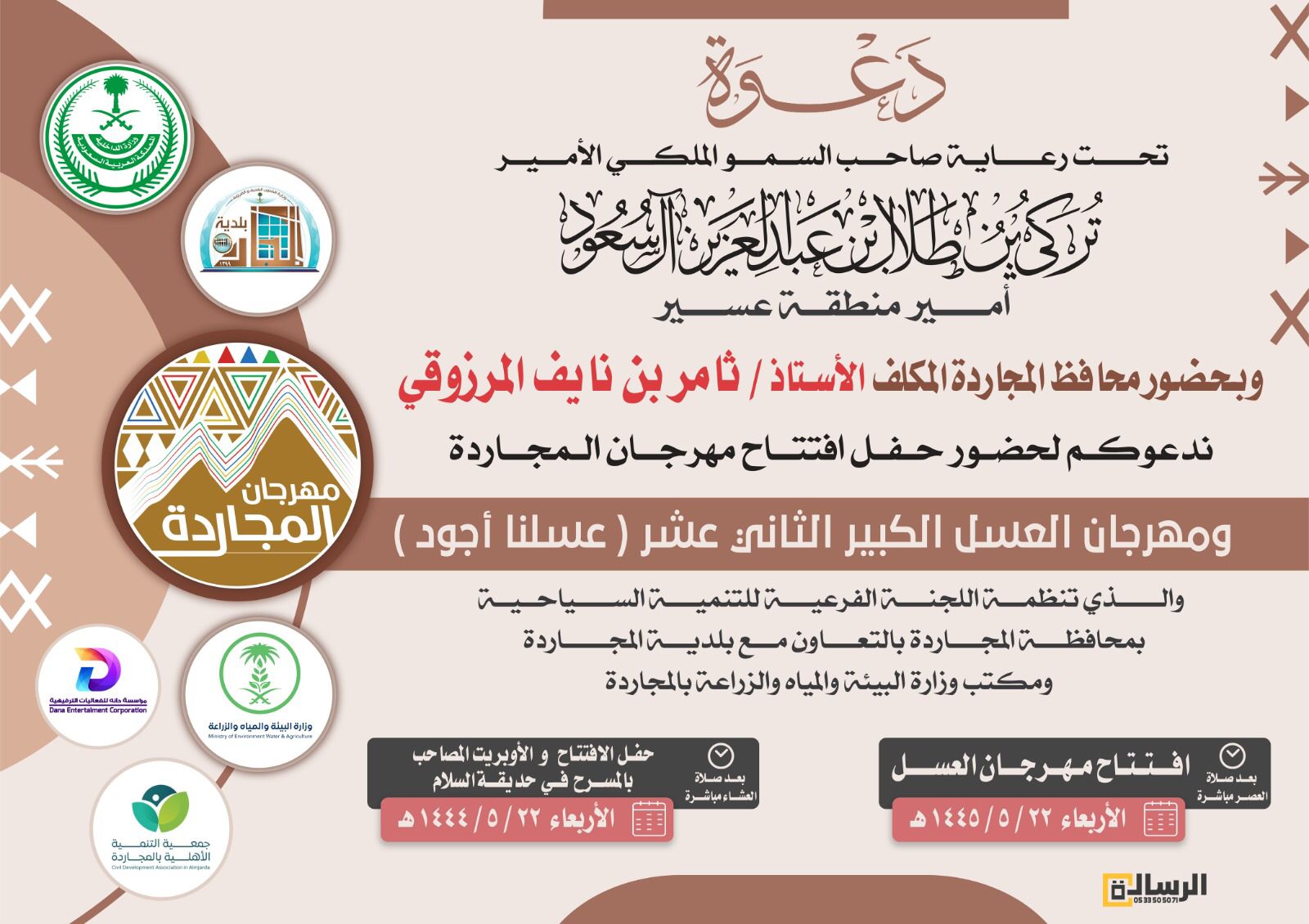 تتشرف اللجنة الفرعية للتنمية السياحية بمحافظة المجاردة أن تدعوكم لحضور حفل افتتاح مهرجان المجاردة والمتضمن انطلاق مهرجان العسل الكبير الثاني عشر تحت شعار (عسلنا أجود)والذي تنظمه اللجنة الفرعية للتنمية السياحية بالتعاون مع مكتب وزارة البيئة والمياه والزراعة وكذلك بلدية المجاردة وبرعاية من جمعية التنمية الأهلية ومؤسسة دانة للاحتفالات حيث سيتم افتتاح مهرجان العسل بعد صلاة العصر يوم الاربعاء٢٢/ ٥ / ١٤٤٥ في صالة المعارض وسيقام الحفل الخطابي والاوبريت المصاحب بعد صلاة العشاء يوم الأربعاء ٢٢/ ٥ / ١٤٤٥ في مسرح حديقة السلام متمنين للجميع أطيب الاوقات وأسعدها.