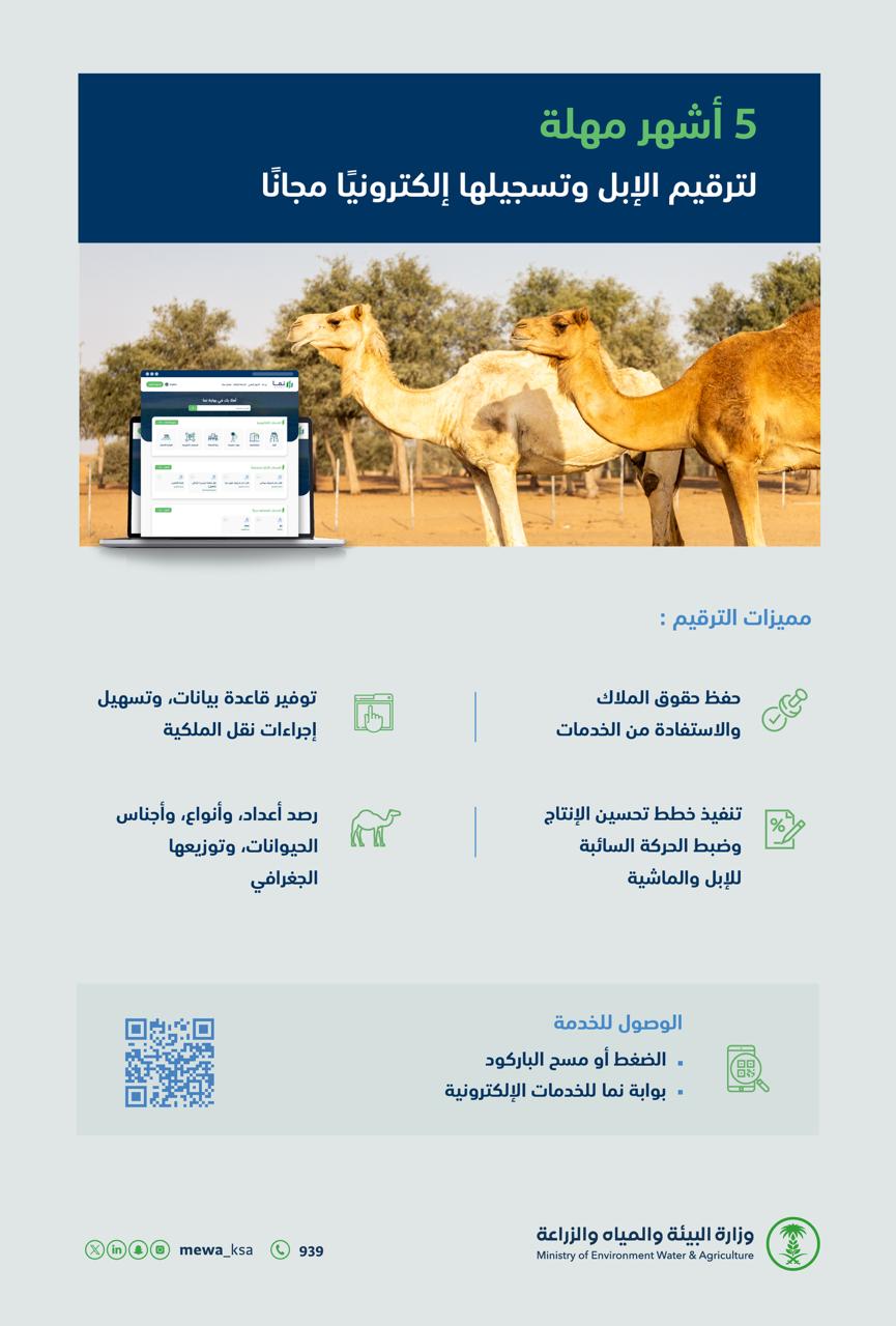 داعية مُلاك الإبل إلى الإسراع بالترقيم والتسجيل الإلكتروني لحفظ حقوقهم، والاستفادة من المزايا والخدمات المقدّمة لهم.
