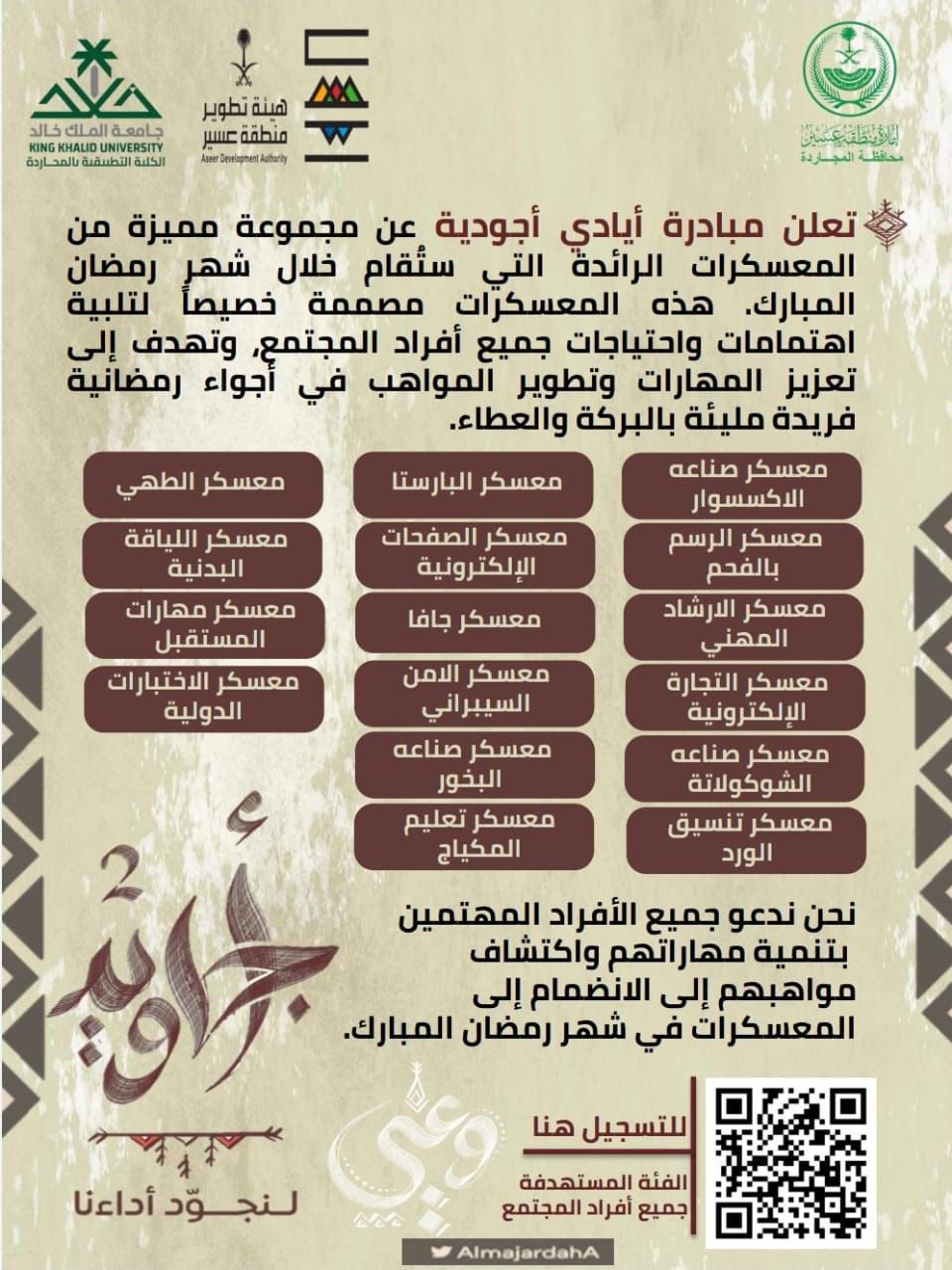 ضمن مبادرات أجاويد٢ بمحافظة المجاردة انطلقت مبادرة (أيادي أجودية) والتي يشرف عليها فريق عمل من الكلية التطبيقية بمحافظة المجاردة بالتنسيق مع غرفة عمليات المبادرة بالمحافظة حيث أن المبادرة عبارة عن مجموعة من المعسكرات الرائدة المصممة خصيصاً لتلبية اهتمامات واحتياجات جميع افراد المجتمع وتهدف الى تعزيز المهارات وتطوير المواهب في أجواء رمضاني مليئة بالبركة والوعي والعطاء علماً أن التسجيل متاح من خلال الباركود المعلن في بروشور الاعلان المرفق .