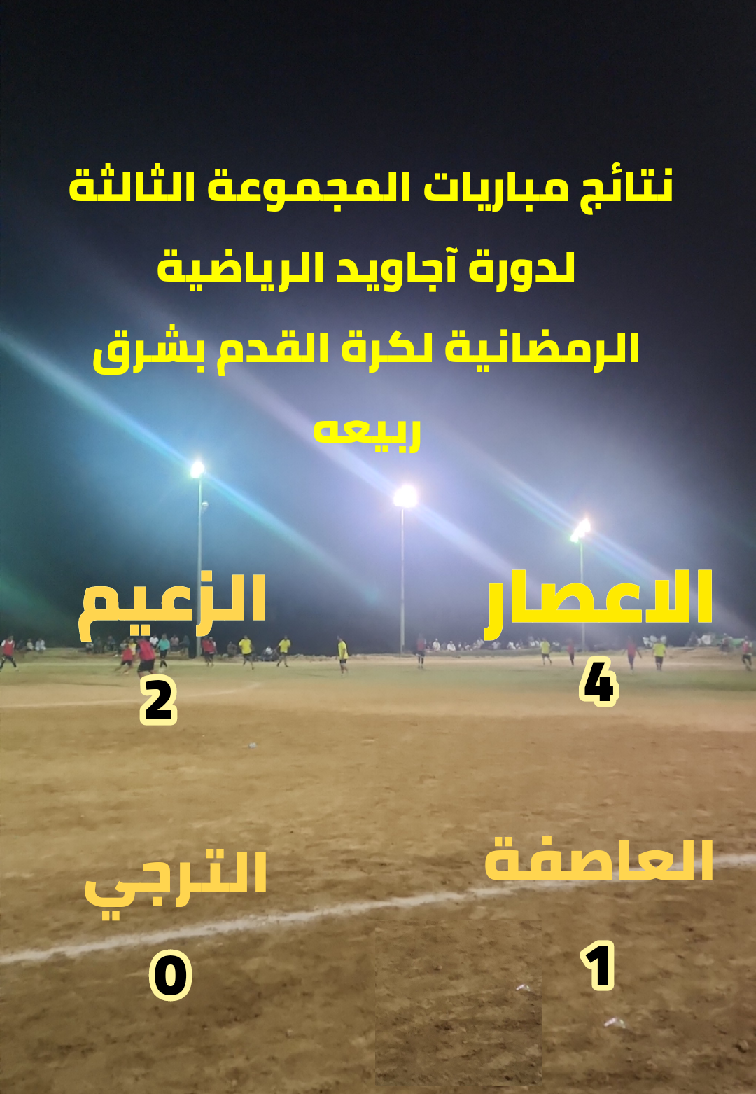أقيم مساء أمس السبت مواجهتين ضمن منافسات دورو آجاويد الرياضية الرمضانية لكرة القدم بشرق ربيعة المقاطرة حيث جمع اللقاء الأول فريقي الاعصار والزعيم وانتهى بفوز الاعصار باربعه أهداف مقابل هدفين