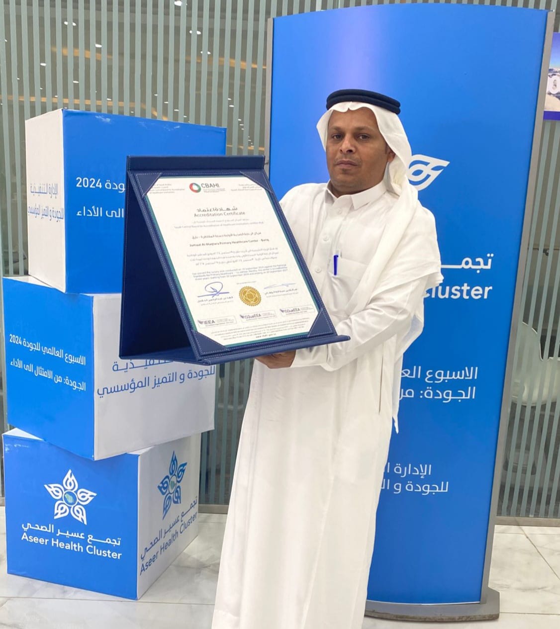 كرم مدير التجمع الصحي بعسير مدير مركز صحي جمعةربيعةالمقاطرة الاخصائي /عامر خضير عويضة الربعي بمناسبة حصول المركز الصحي على شهادة الإعتماد سباهي تهانينا والف مبررووك