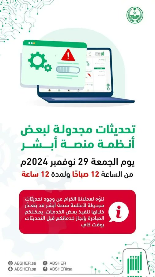 أعلنت منصة وزارة الداخلية الإلكترونية “أبشر” عن إجراء تحديثات لبعض أنظمة خدماتها يوم الجمعة القادم بدءًا من الساعة الـ (12) صباحًا حتى الساعة الـ (12) ظهرًا.
