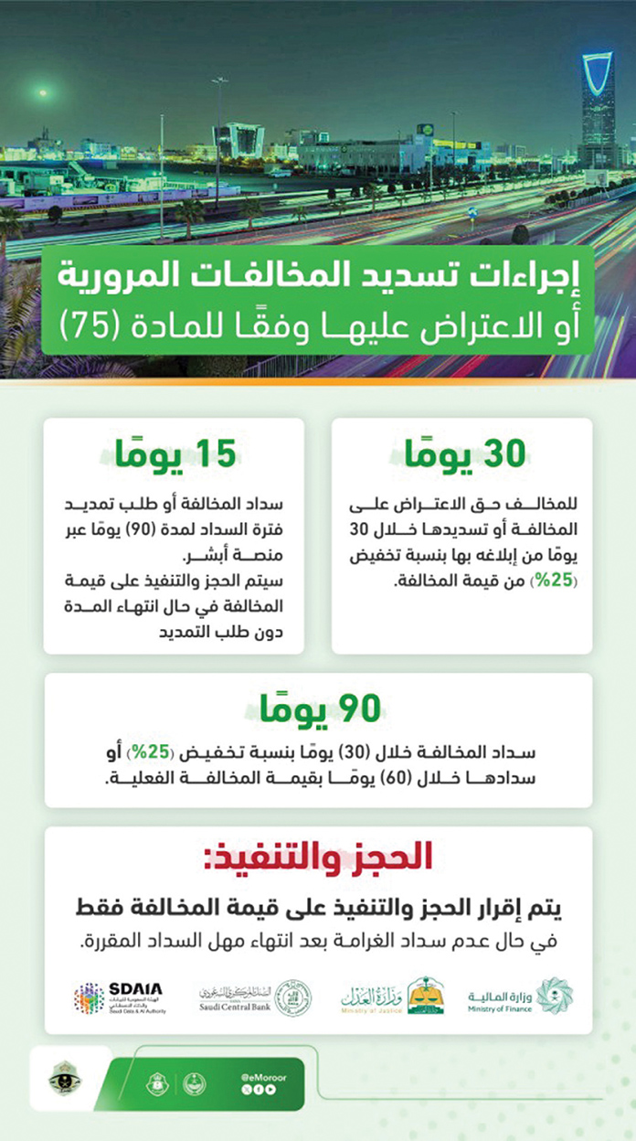 وبيّن المرور أن المخالف بإمكانه كذلك سداد المخالفة خلال أول 30 يوماً بخصم (25 %)، أو خلال 60 يوماً بعدها بالقيمة الفعلية للمخالفة دون خصم، وفي حال انتهاء المهلة دون سداد أو تقديم طلب تمديد، يتم رفع المخالفة إلى الجهات المختصة لاتخاذ إجراءات الحجز والتنفيذ على قيمة المخالفة فقط.