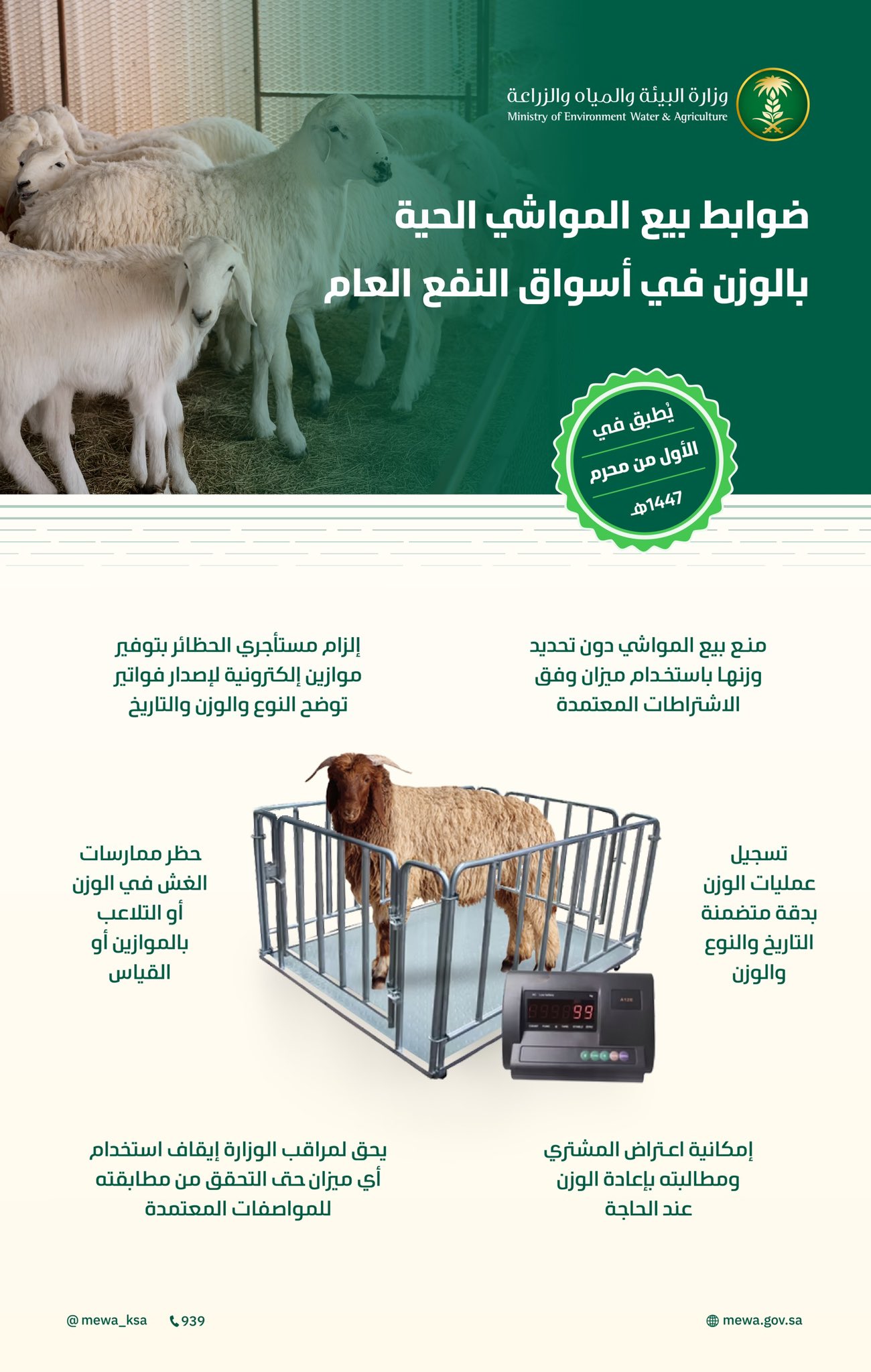 تُعلن وزارة البيئة والمياة والزراعة عن بدء تطبيق ضوابط بيع المواشي الحية بالوزن في أسواق النفع العام اعتبارًا من يوم الخميس المقبل،
