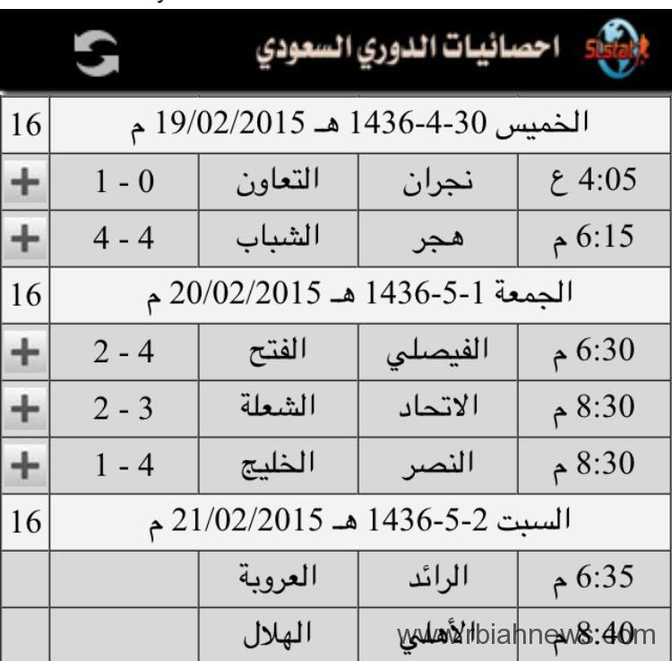 حقق الفريق النصراوي فوز كبيرا قبل قليل علی ضيفة فريق الخليج برباعية مقابل هدف واحد وكان البادی بتسجيل الفريق الضيف بهدف مبكر الا ان الفريق النصراوي انتفض وسجل اربعة اهداف تناوب علی تسجيلها السهلاوي وغالب والفريدي هدفين بهذا الفوز انفرد الفريق الاصفر بصدارة الدوري ب41نقطة وفي بقية اللقاءات تغلب الفيصلي علی فريق الفتح ب4اهداف مقابل 2 وفي جدة حقق الاتحاد فوزا علی فريق الشعلة ب3مقابل 2ويستكمل مساء غدا لقاءات الجولة 16بلقاء الهلال والاهلي وكذالك الرائد والعروبة