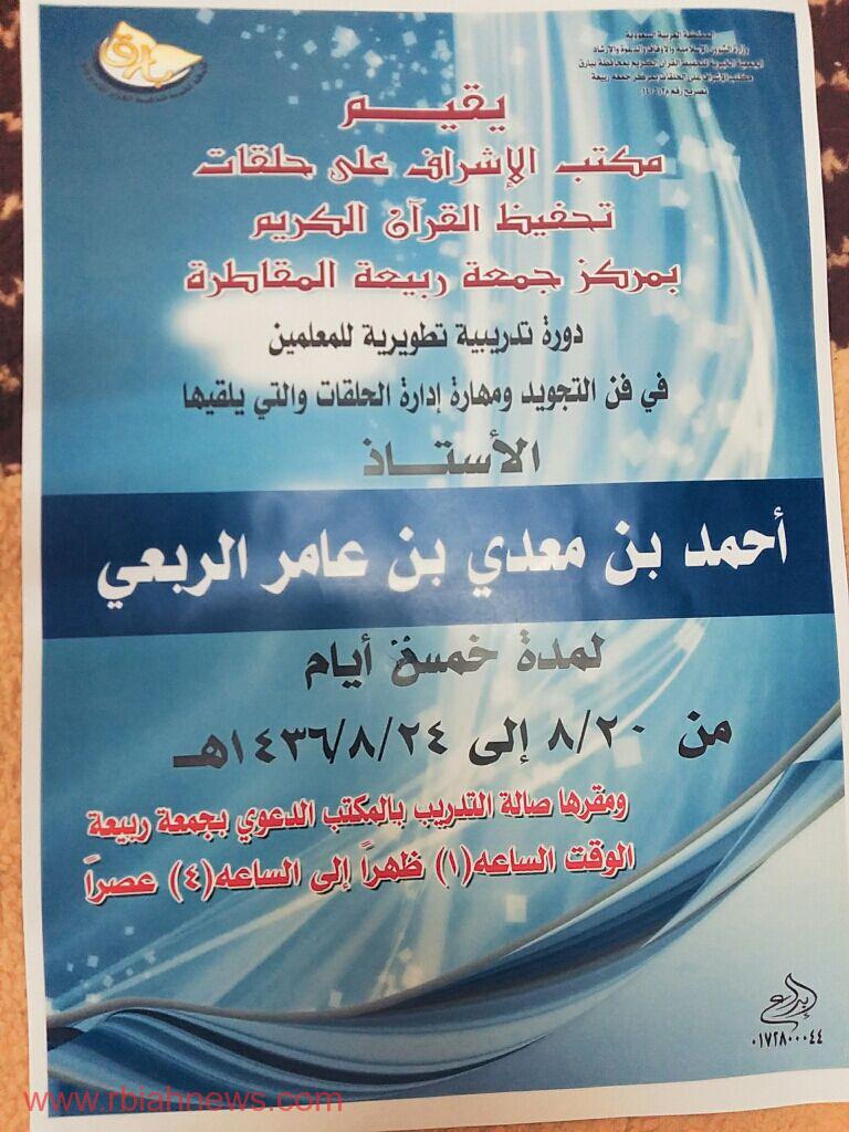 يحتضن مكتب الإشراف علی حلقات القران الكريم بمركز جمعه ربيعة دورة تطويرية للمعلمين في فن التجويد ومهارة أدارة الحلقات ويلقيها الشيخ والاستاذ/أحمد بن معدي بن عامر الربعي خلال الفترة من 20-24من هذا الشهر وذالك بصالة التدريب بمقر المكتب الدعوي بمركز جمعه ربيعة المقاطرة